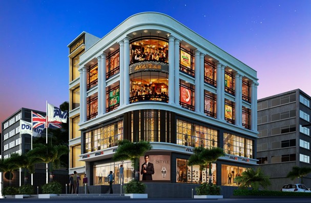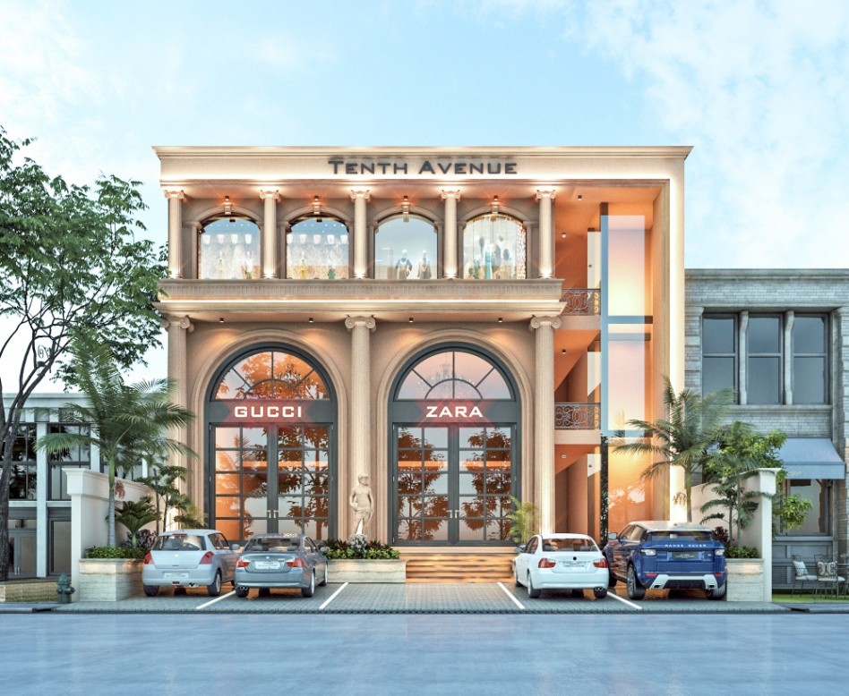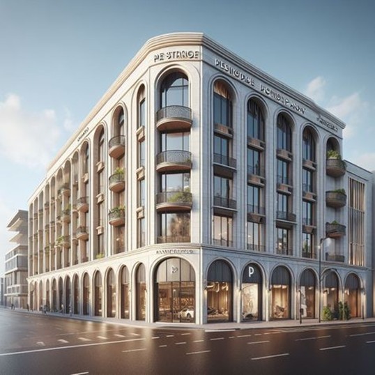 A luxurious commercial complex with a neoclassical design featuring tall columns, arched balconies, and grand glass facades.