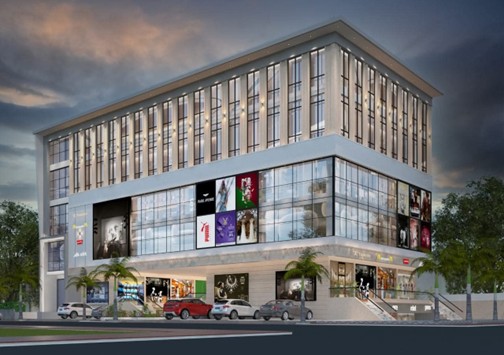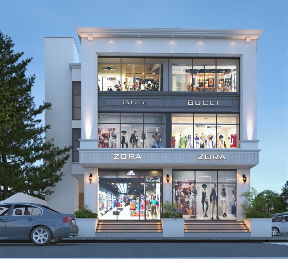 Contemporary façade – sleek vertical fins on the upper floors paired with full glass walls give a cutting-edge corporate-retail look.