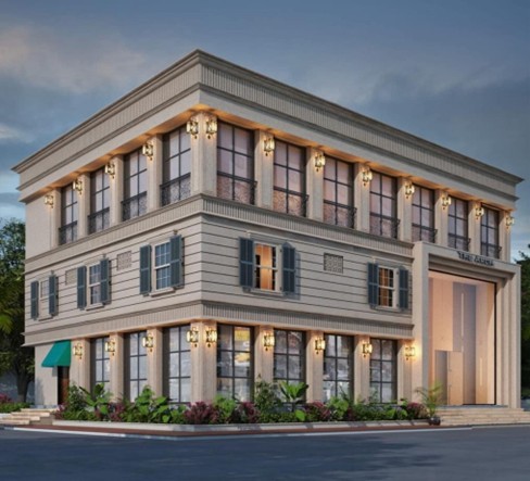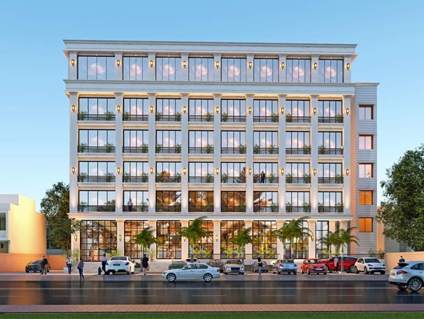 This building exudes a contemporary European charm with its grand arched façade, rhythmic vertical lines, and clean stone finishes.