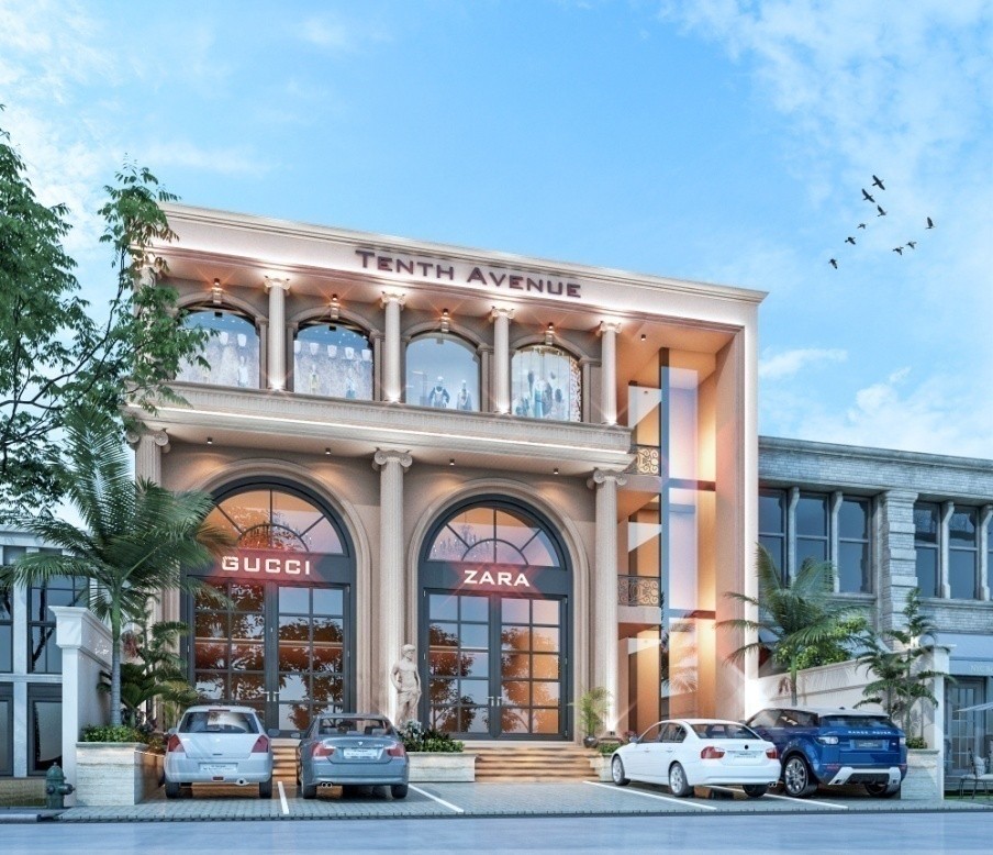This is a luxury commercial building with a neoclassical facade, tall columns, and grand arched windows. The ground floor hosts Asics and Adidas showrooms, while the upper floor features arched balconies for premium retail. A glass side stairwell adds a modern touch. The frontage includes parking, palm landscaping, and statues, giving it an upscale, elegant appeal under the name “Bake N sake.”