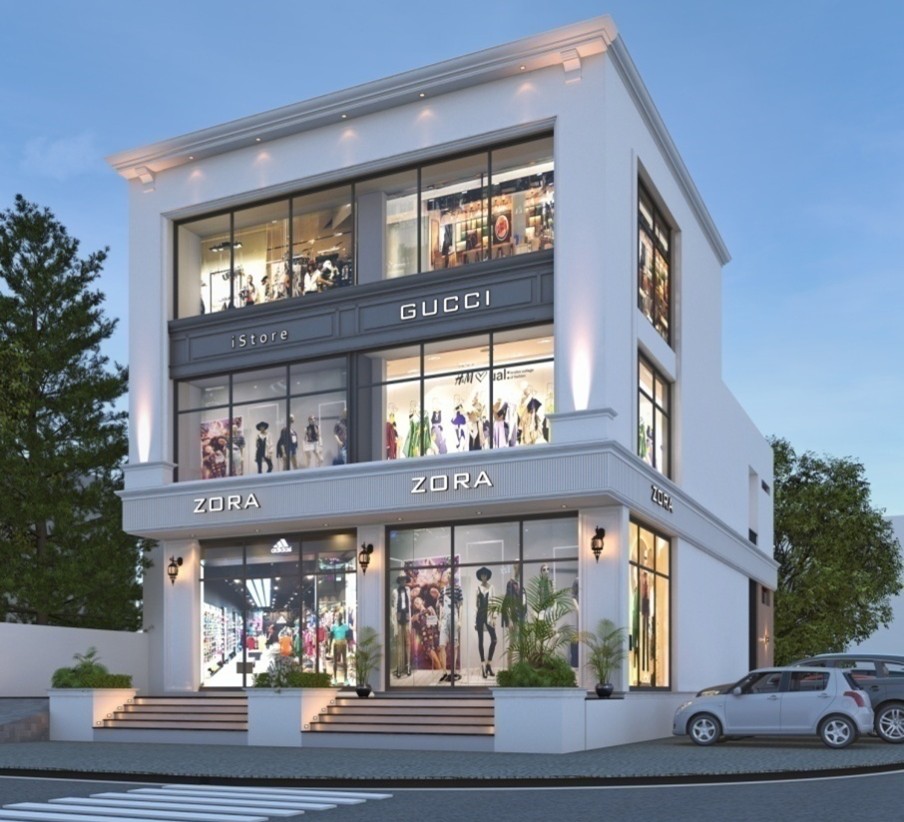 Ground floor: Fashion outlets (ZORA, Adidas) with glass frontage and central stepped entry.