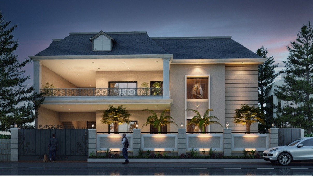 This residence reflects a timeless classical elegance with its pitched slate roof, symmetrical façade, and refined detailing. The wide balcony with ornate railings and columned supports adds grandeur, while warm façade lighting enhances its charm in the evening. Large windows bring in openness and natural light, while the landscaped forecourt with palms softens the structure, creating a serene and inviting atmosphere. Overall, the design balances dignity and comfort, giving the home a stately yet welcoming character.