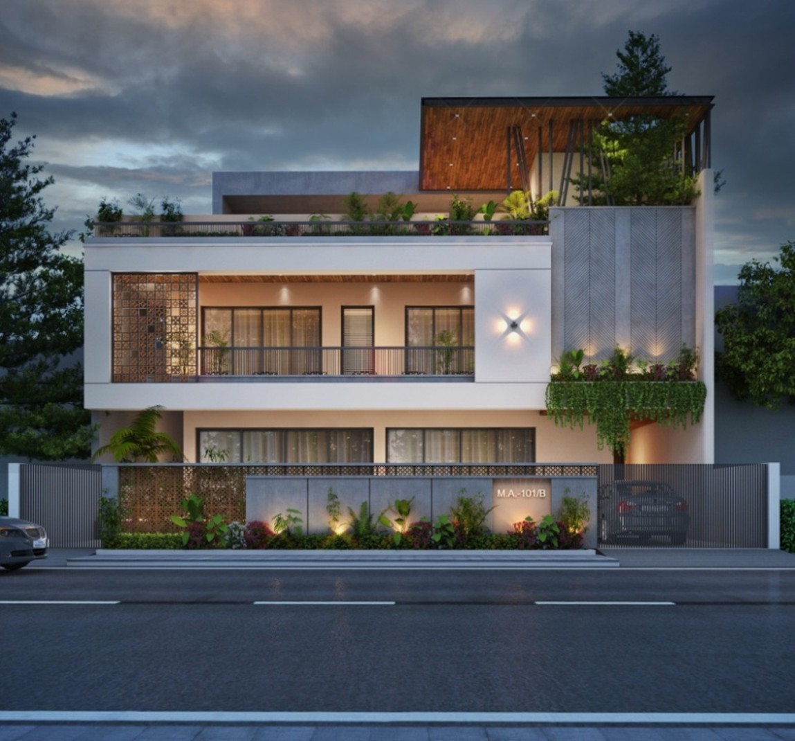 This residence showcases a sleek contemporary design with clean horizontal lines, warm wooden accents, and beautifully integrated greenery. The façade is highlighted by perforated screens, linear balconies, and expansive glazing that balance privacy with openness. Subtle lighting enhances textures and creates an elegant evening presence, while the landscaped terrace and vertical garden elements bring nature into the architecture. Overall, it’s a modern, refined, and sustainable urban home that blends style with comfort.