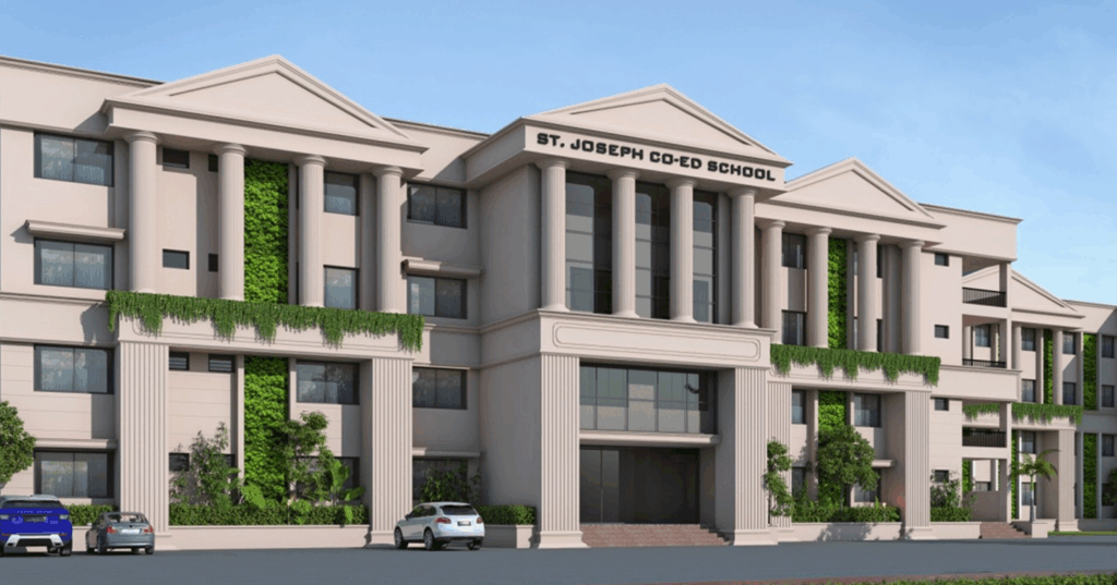 This school building design reflects a grand neoclassical style, highlighted by tall columns, triangular pediments, and a strong symmetrical layout. The façade is softened with vertical green walls and cascading planters, blending academic dignity with sustainability. Large glazed openings ensure ample daylight, while the central entrance with its prominent portico establishes a strong institutional identity. The balanced use of stone textures, greenery, and clean lines gives the campus a modern yet timeless character—symbolizing knowledge, growth, and excellence.