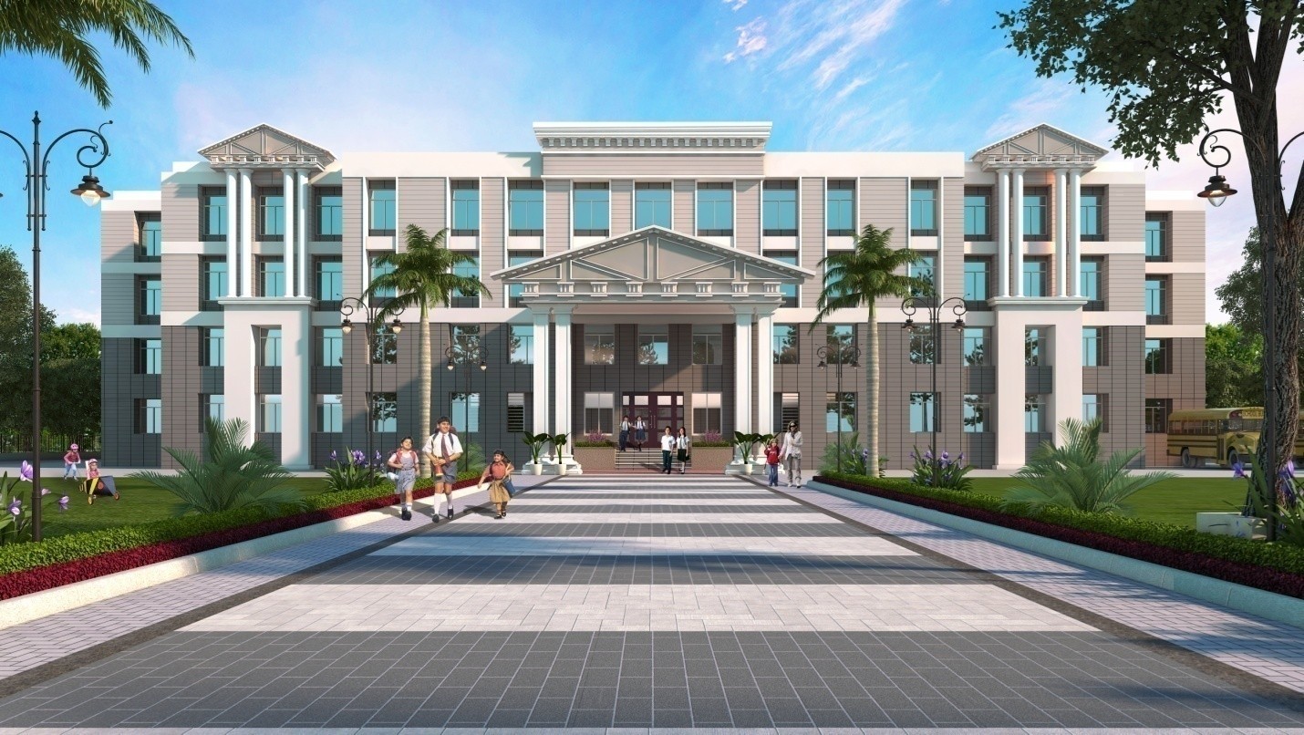 The design of Mother Teresa School, Obedullaganj, reflects a modern institutional character enriched with classical elements. The central portico with tall columns and a pediment creates a grand, welcoming entrance, while the symmetrical façade conveys discipline and order. Vertical window panels ensure abundant daylight, and the balanced use of grey cladding with white highlights adds sophistication. Landscaped avenues, open green spaces, and a student-friendly forecourt complete the setting, presenting an inspiring academic environment that blends tradition with contemporary design.